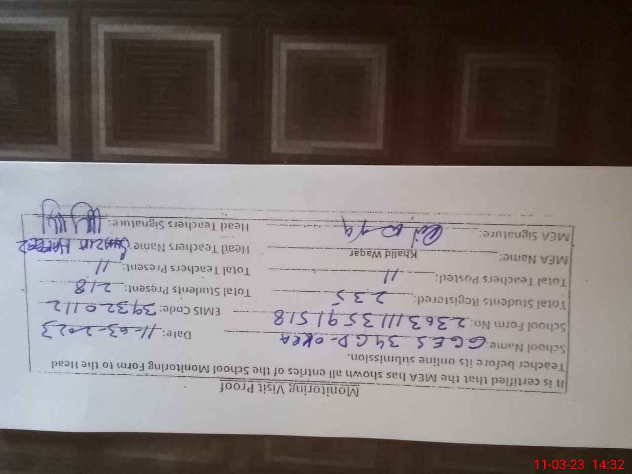 | Certified that this School was Inspected by the Undersigned MEA/DMO Today and the Information Stated Above is as Per Record. | |||||