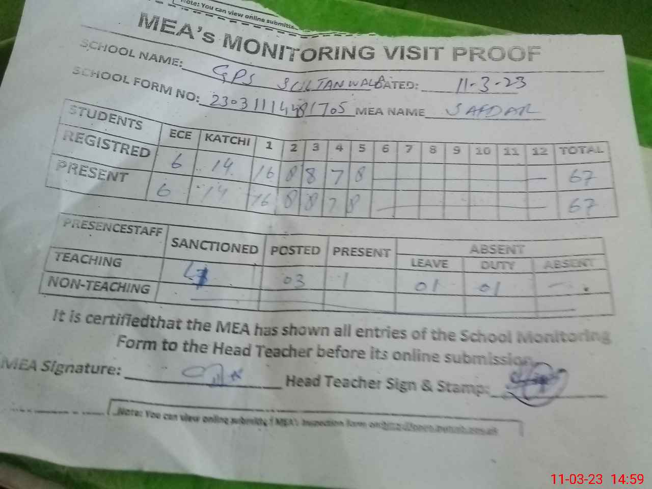 | Attendance Register | Head Teacher | MEA with School | Visit Proof |