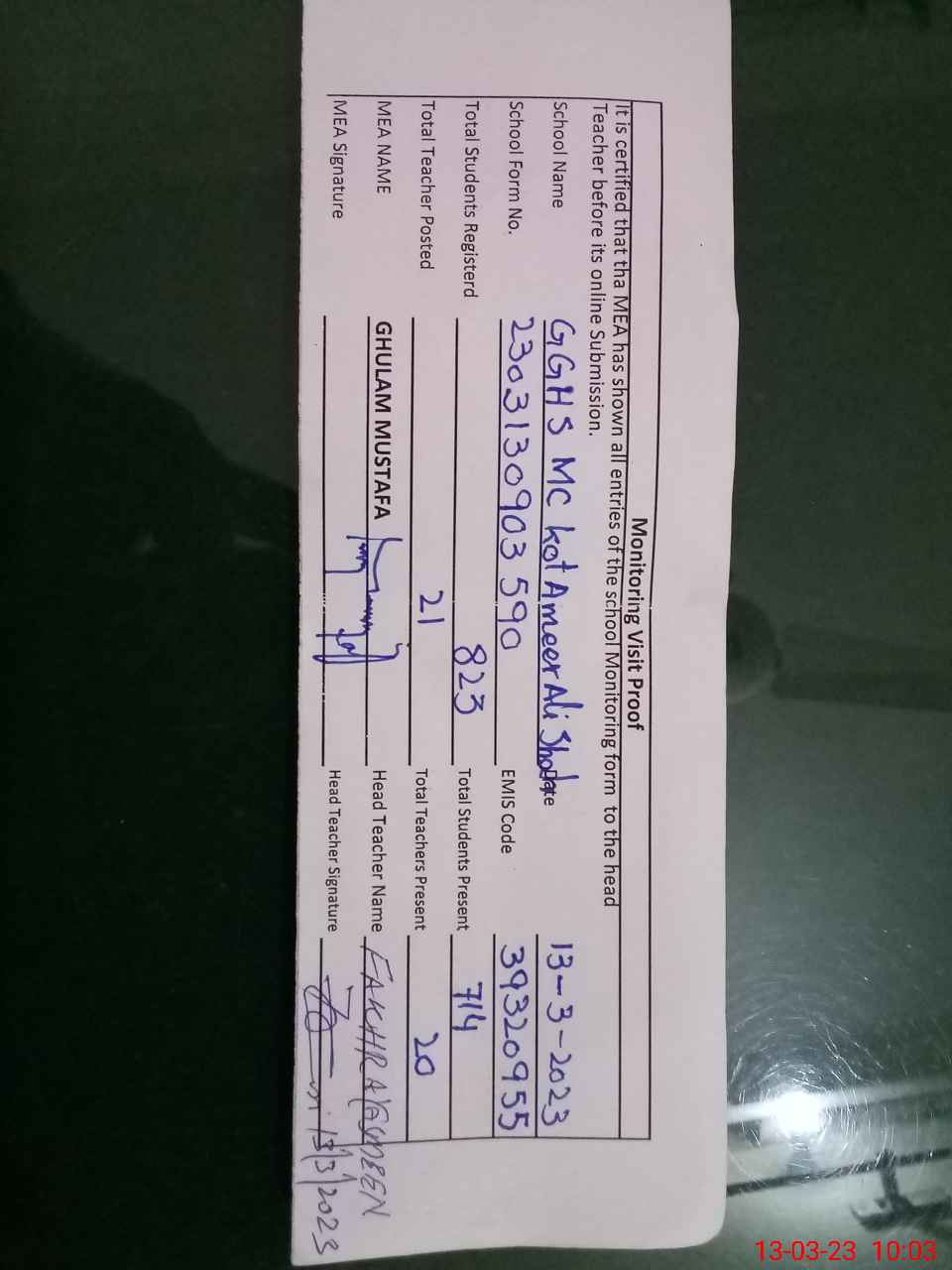 | Attendance Register | Head Teacher | MEA with School | Visit Proof |