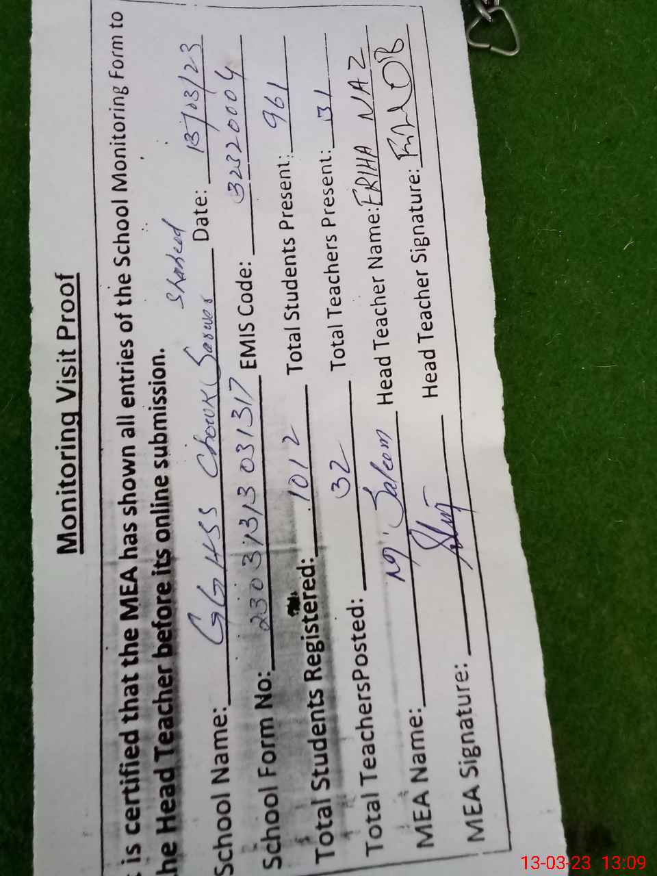 | Attendance Register | Head Teacher | MEA with School | Visit Proof |