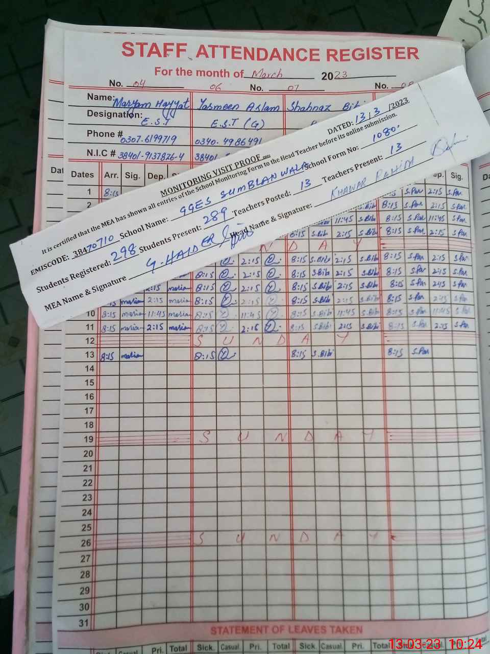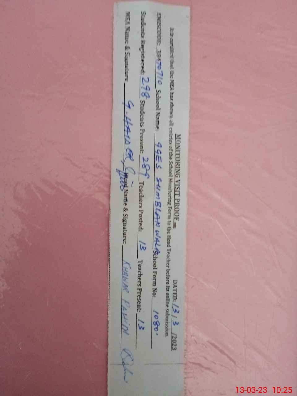 | Attendance Register | Head Teacher | MEA with School | Visit Proof |