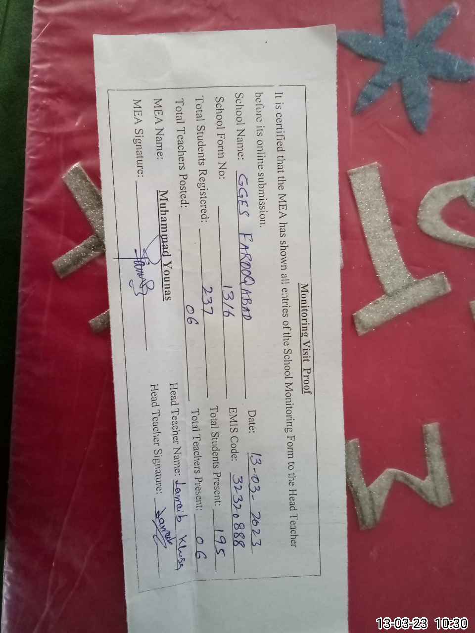 | Certified that this School was Inspected by the Undersigned MEA/DMO Today and the Information Stated Above is as Per Record. | |||||
