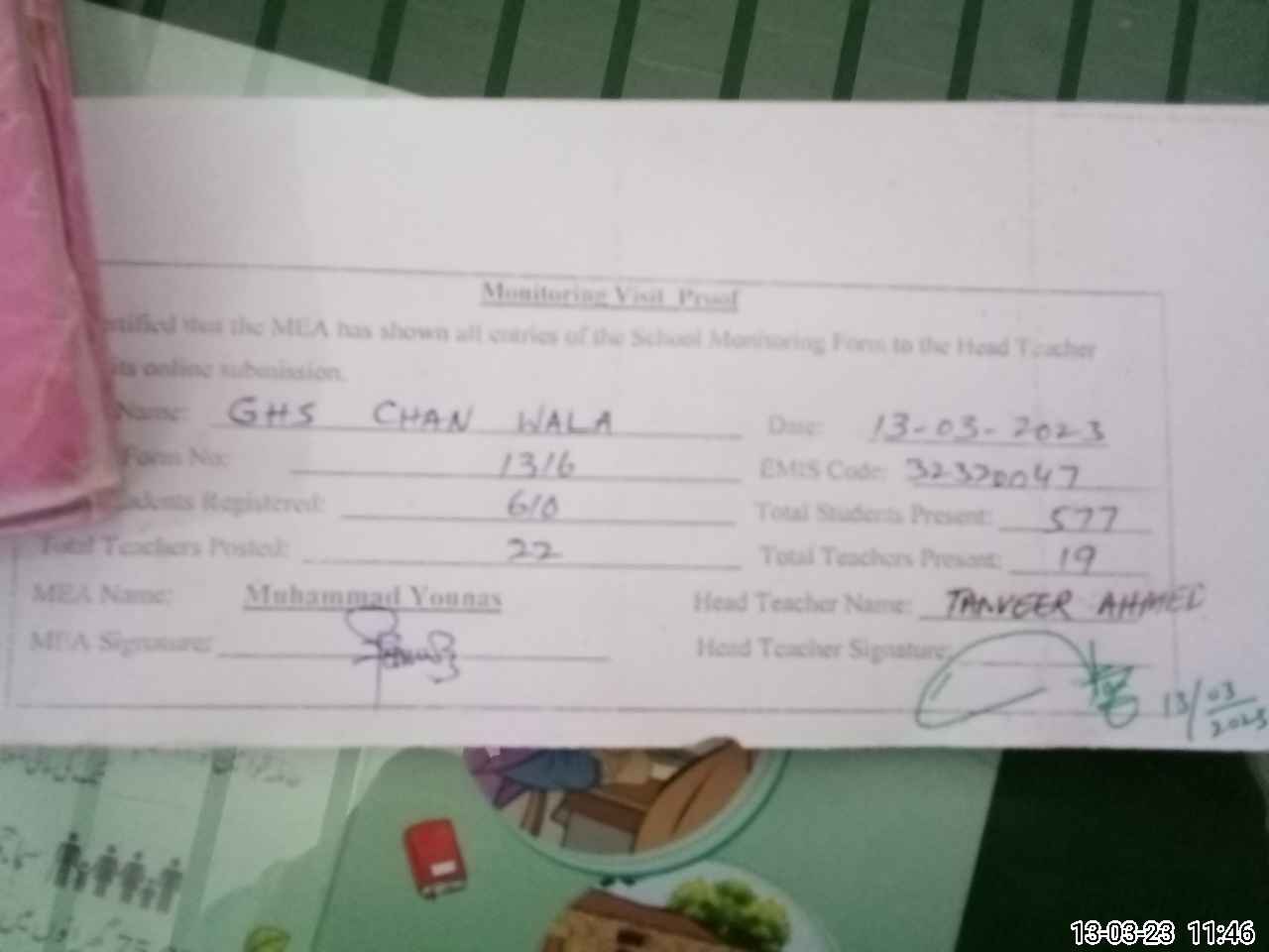 | Attendance Register | Head Teacher | MEA with School | Visit Proof |