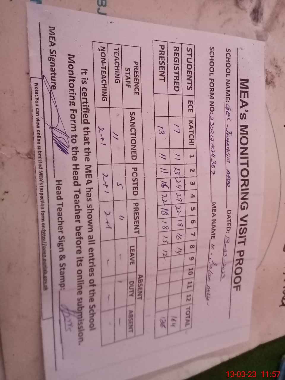 | Attendance Register | Head Teacher | MEA with School | Visit Proof |