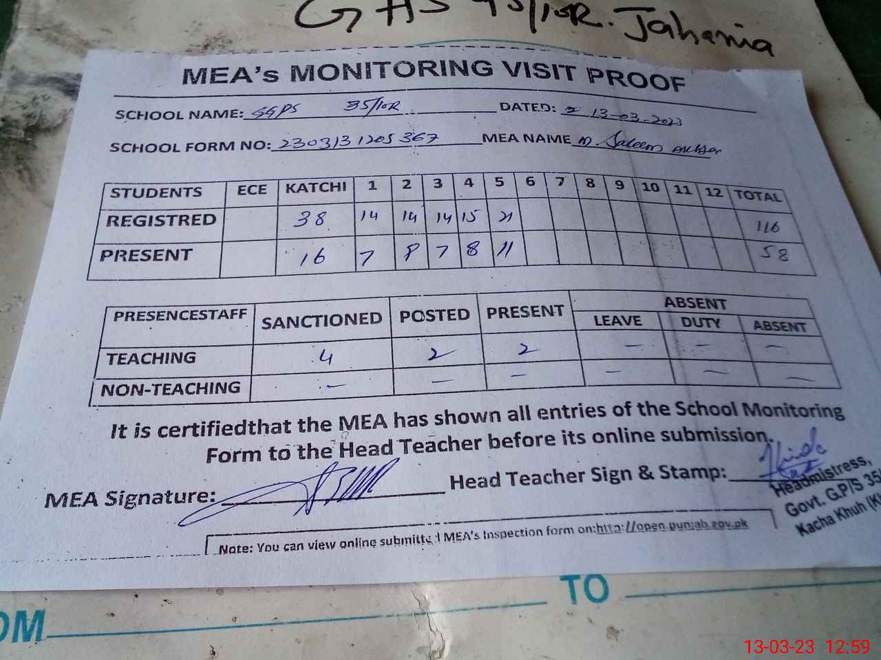 | Attendance Register | Head Teacher | MEA with School | Visit Proof |