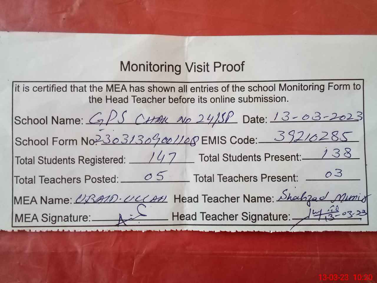 | Attendance Register | Head Teacher | MEA with School | Visit Proof |