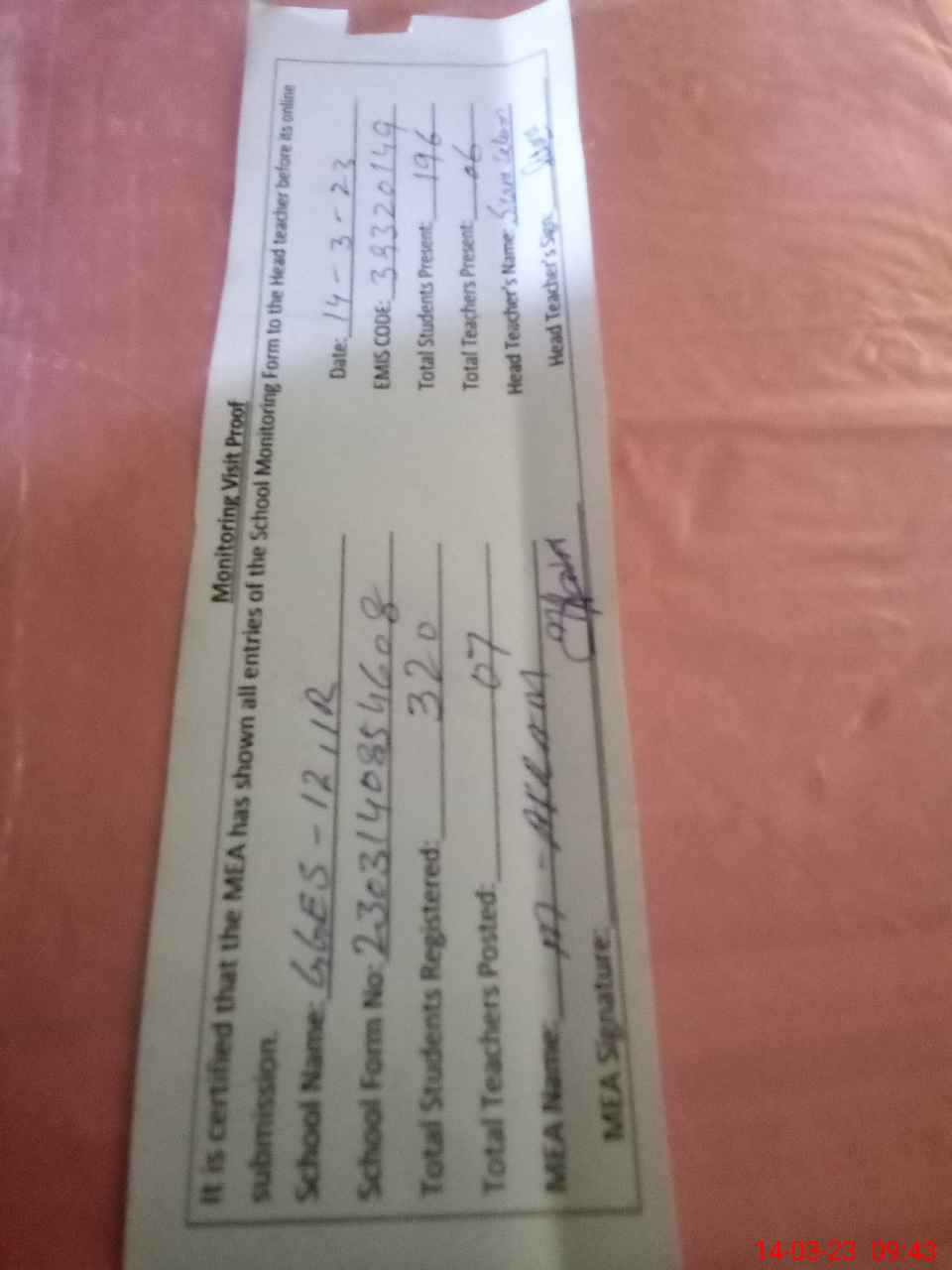 | Attendance Register | Head Teacher | MEA with School | Visit Proof |