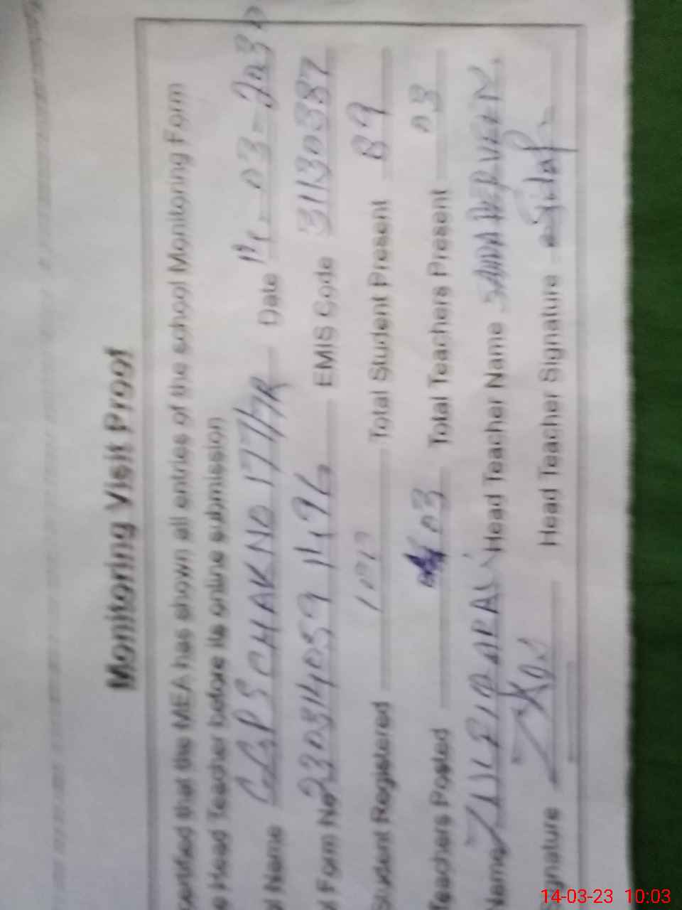 | Attendance Register | Head Teacher | MEA with School | Visit Proof |