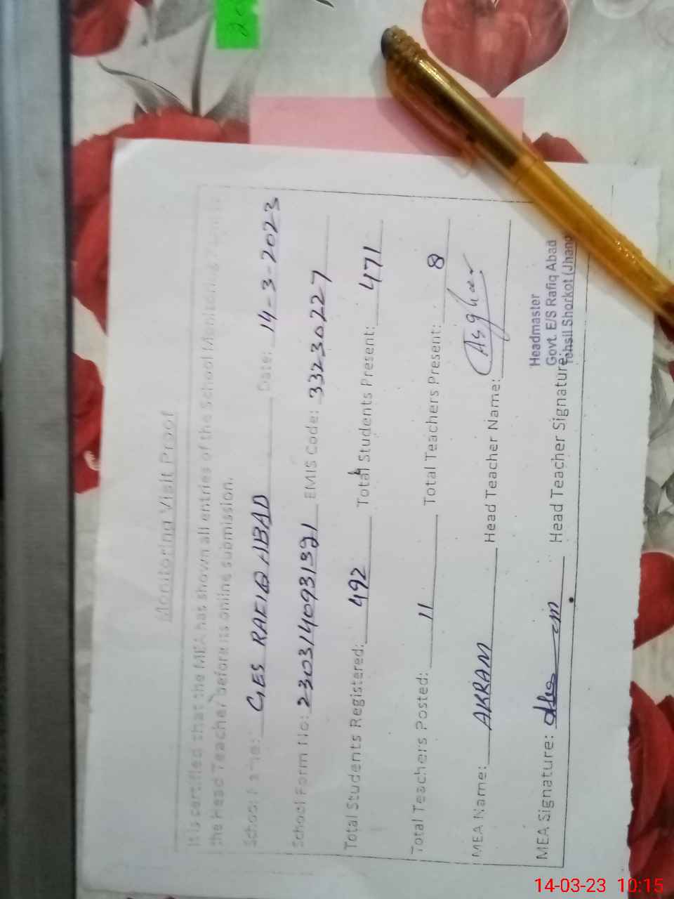 | Attendance Register | Head Teacher | MEA with School | Visit Proof |