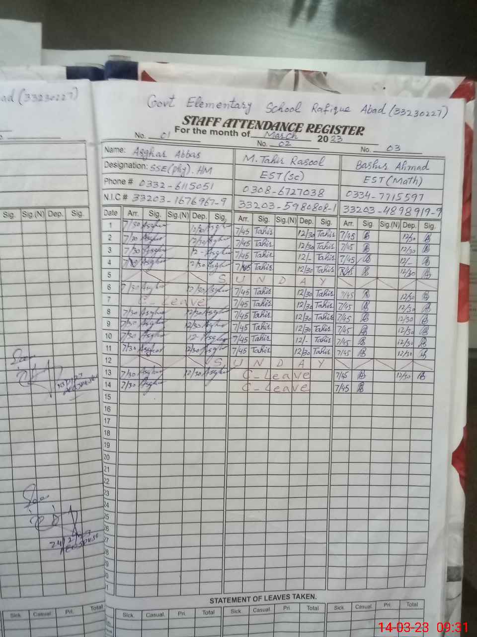 | CNIC | Full Name | Designation | R/C | Absence During Last Calender Month |