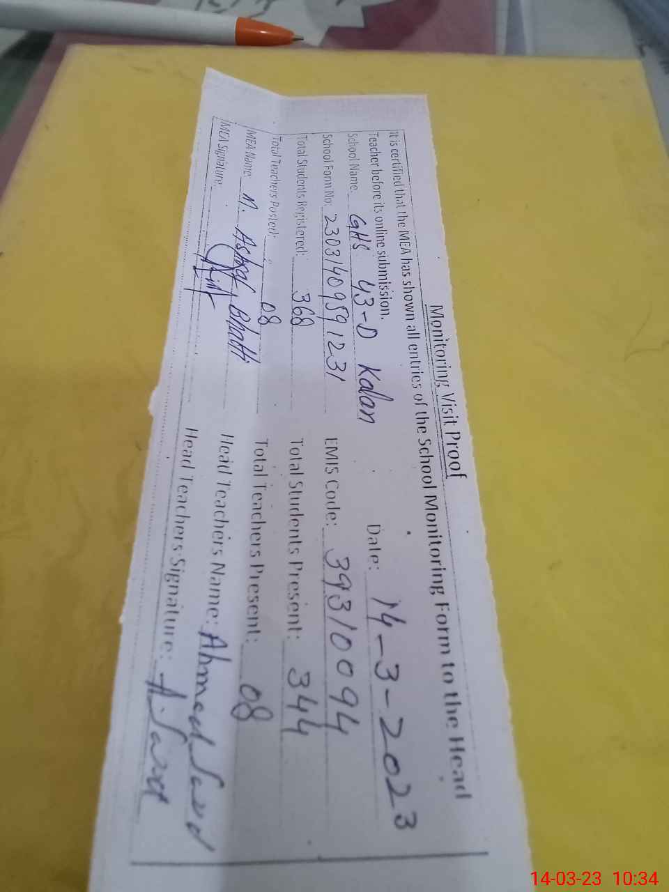 | Attendance Register | Head Teacher | MEA with School | Visit Proof |