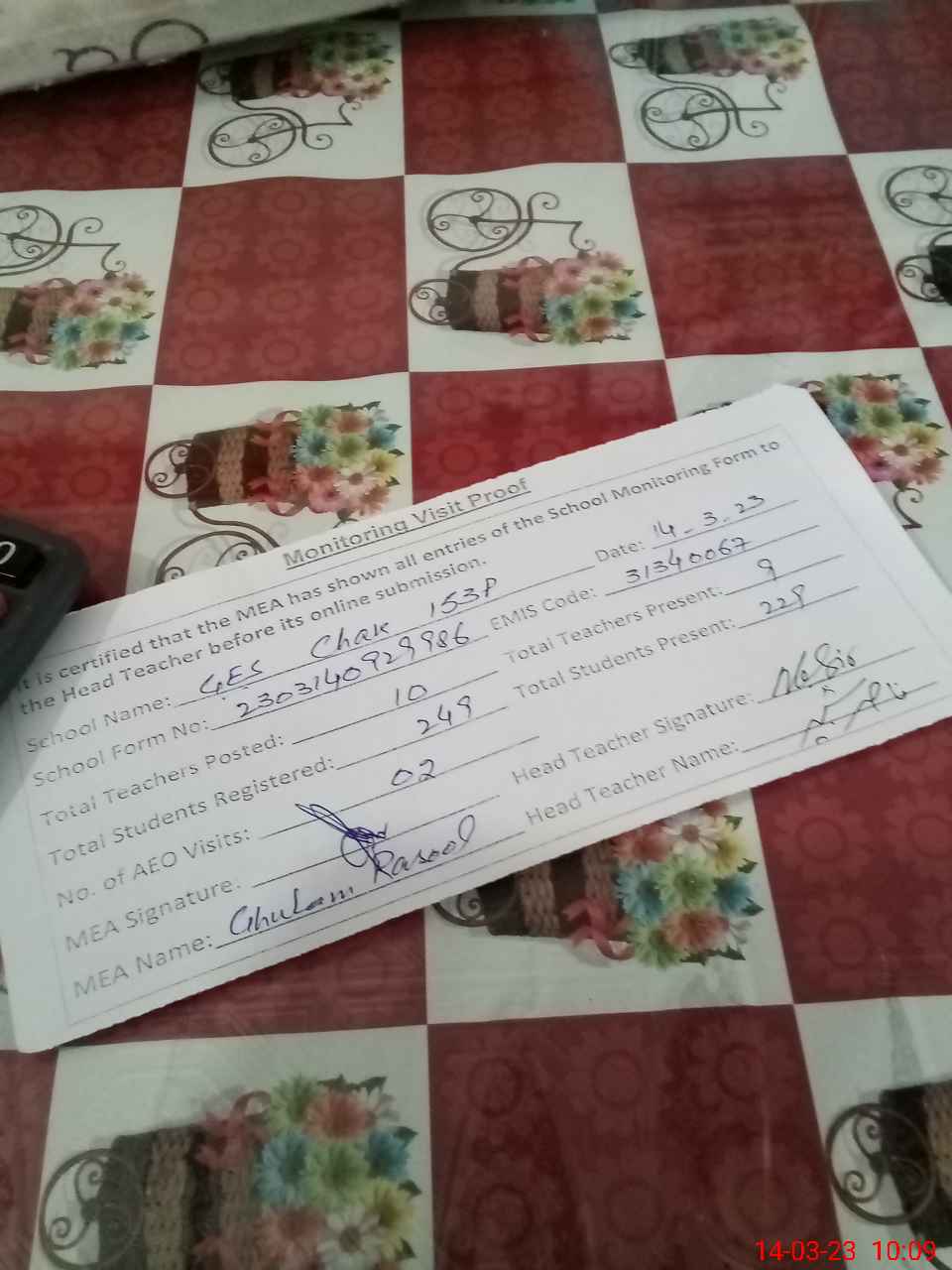 | Attendance Register | Head Teacher | MEA with School | Visit Proof |