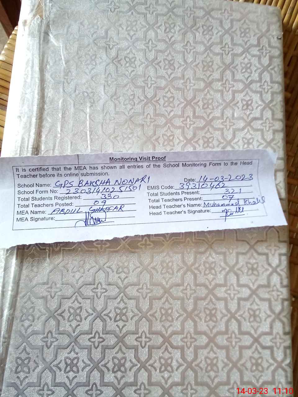 | Attendance Register | Head Teacher | MEA with School | Visit Proof |