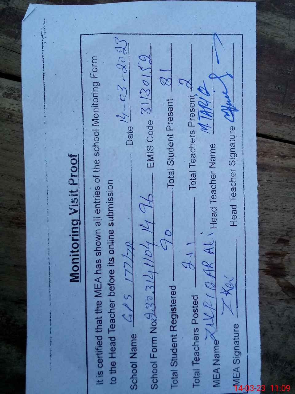 | Attendance Register | Head Teacher | MEA with School | Visit Proof |