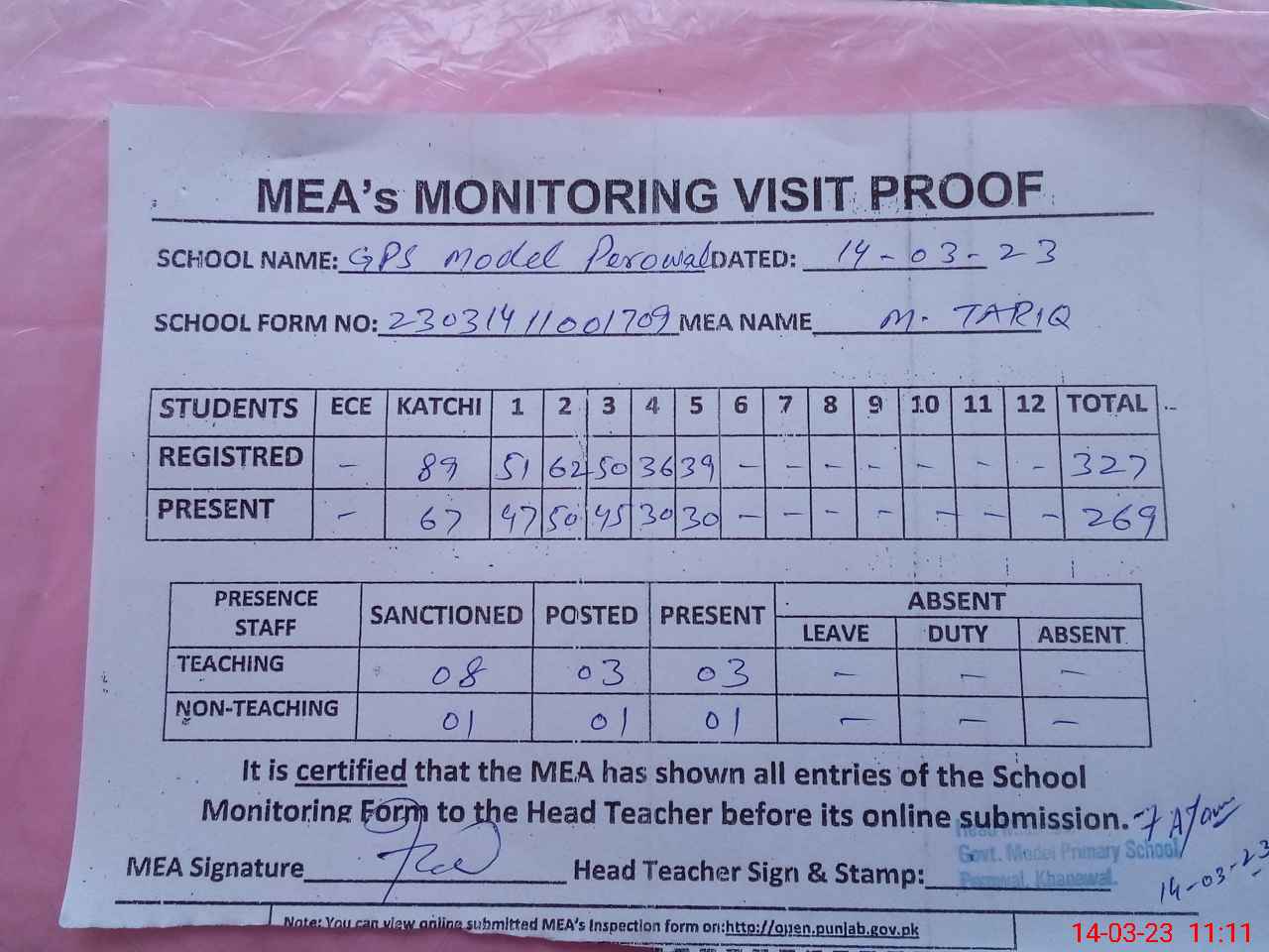 | EMIS Code: 36420412 | Name of School: GPS MODEL PEROWAL, KHANEWAL | |||