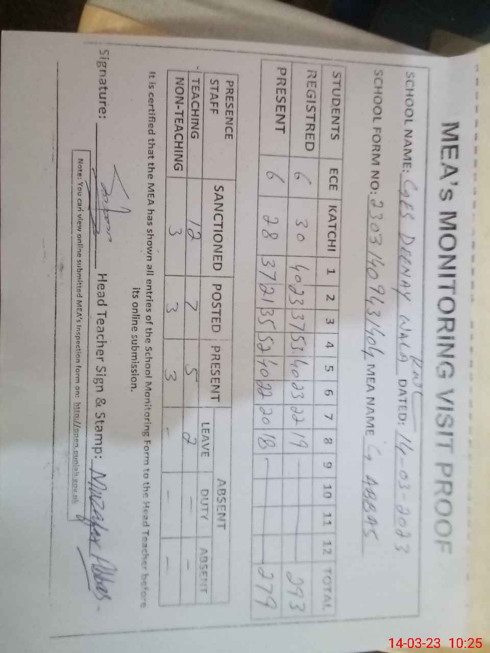 | Attendance Register | Head Teacher | MEA with School | Visit Proof |