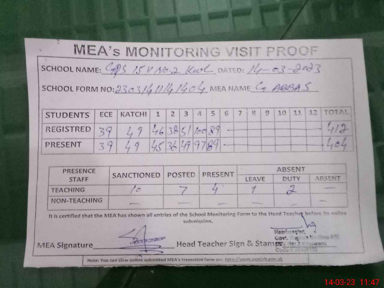 | Attendance Register | Head Teacher | MEA with School | Visit Proof |
