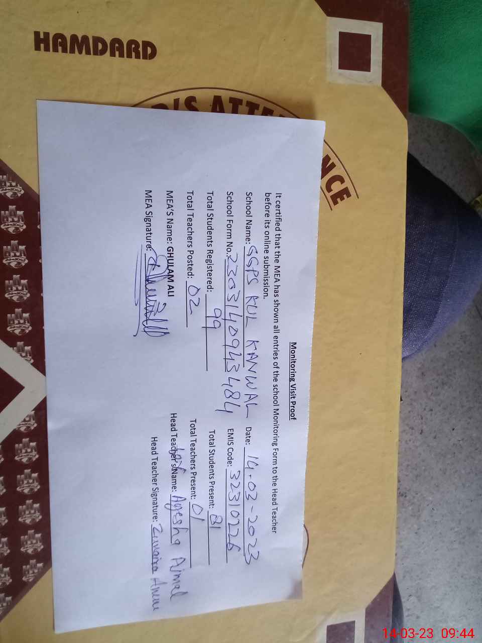 | Attendance Register | Head Teacher | MEA with School | Visit Proof |