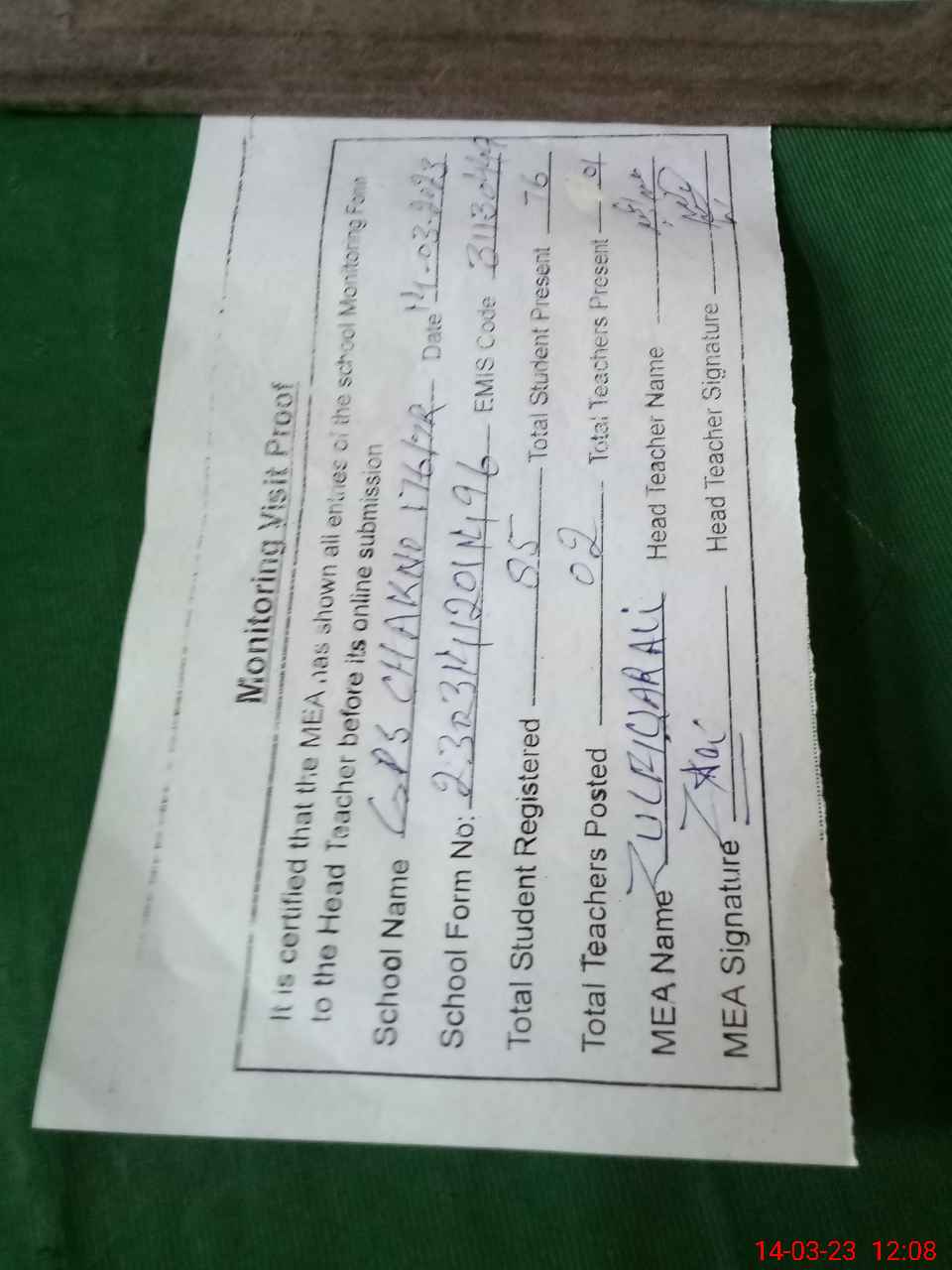 | Attendance Register | Head Teacher | MEA with School | Visit Proof |