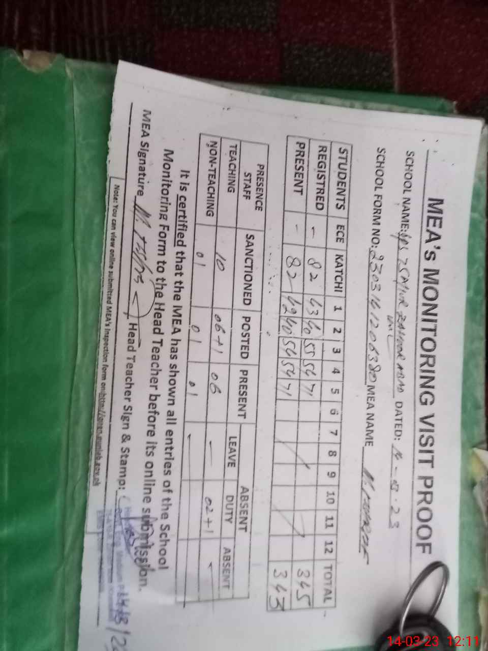 | Attendance Register | Head Teacher | MEA with School | Visit Proof |