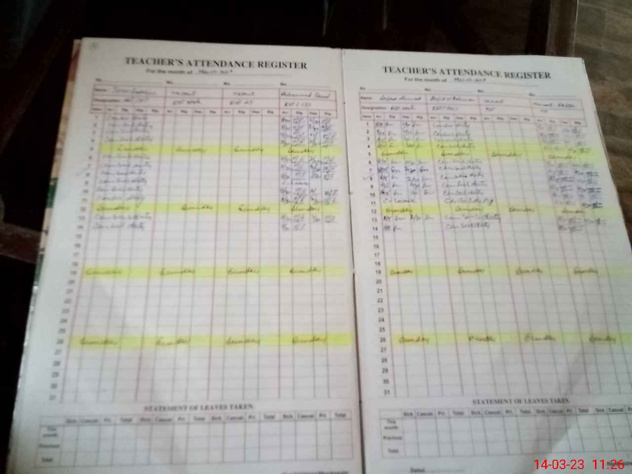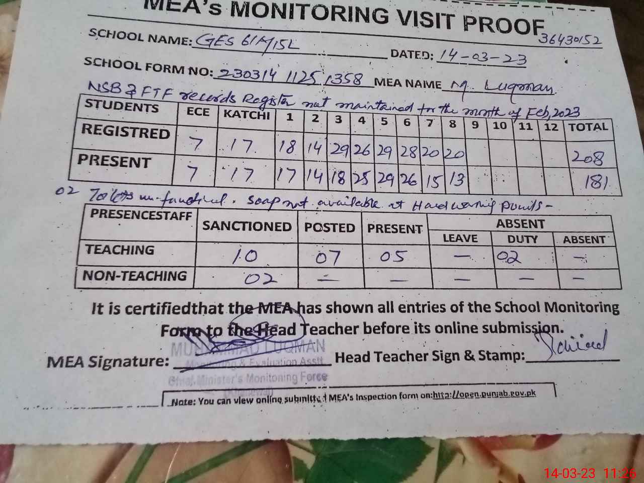 | Attendance Register | Head Teacher | MEA with School | Visit Proof |