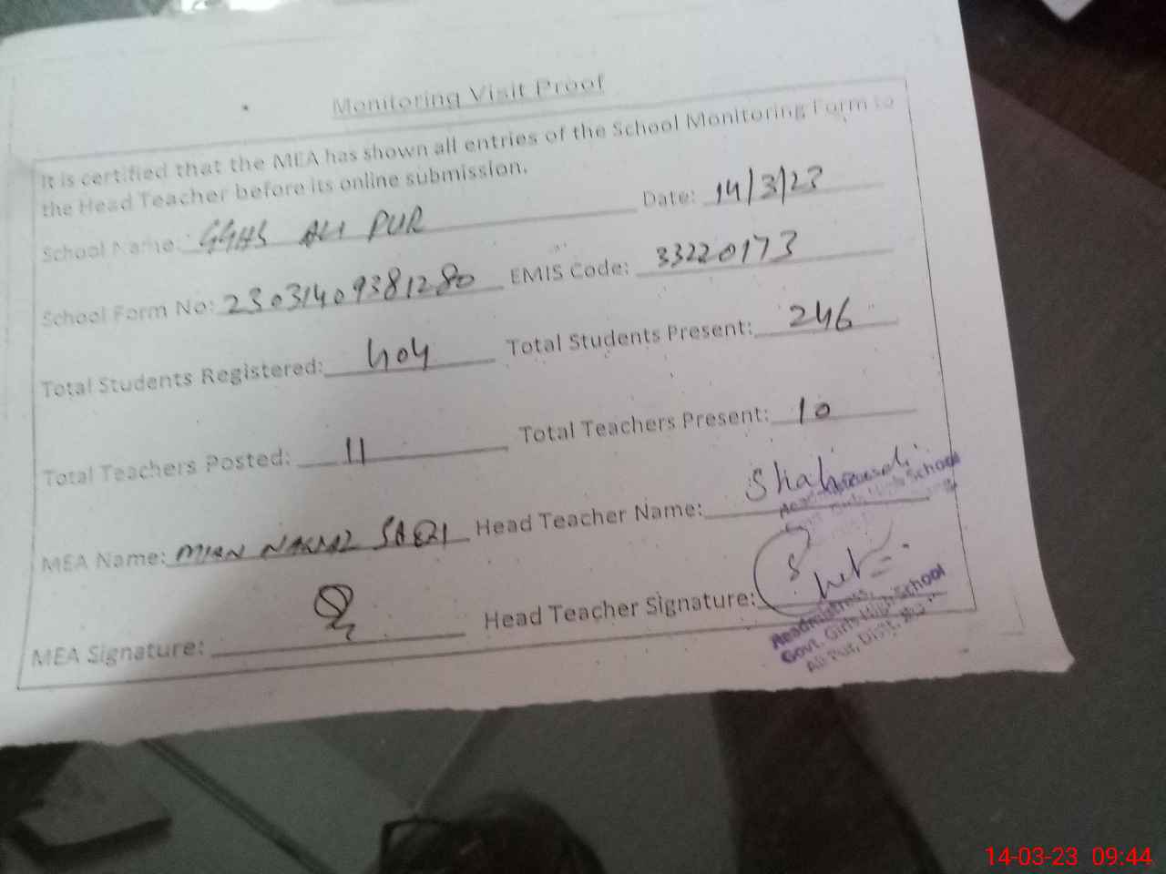 | Attendance Register | Head Teacher | MEA with School | Visit Proof |