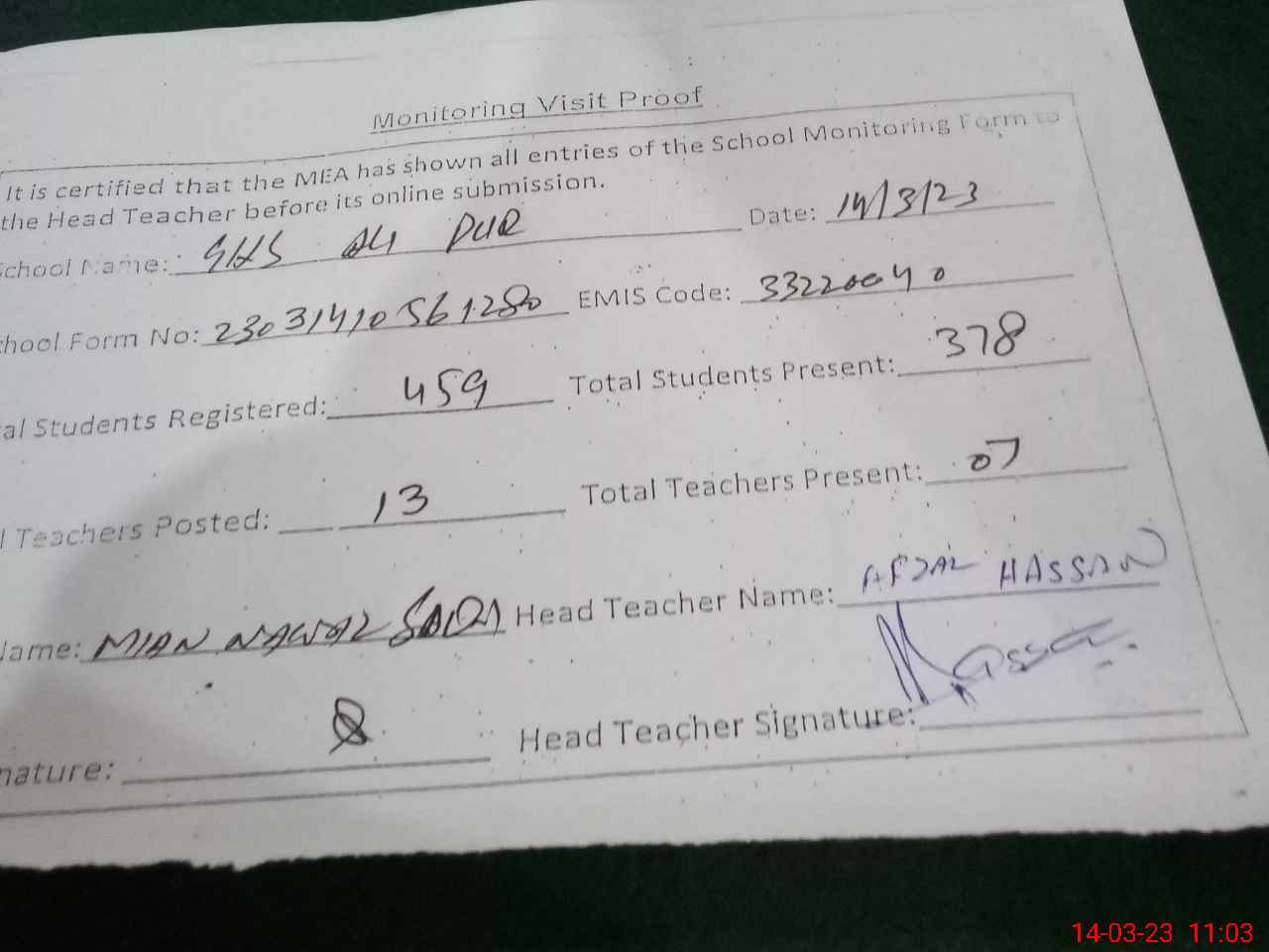 | Attendance Register | Head Teacher | MEA with School | Visit Proof |