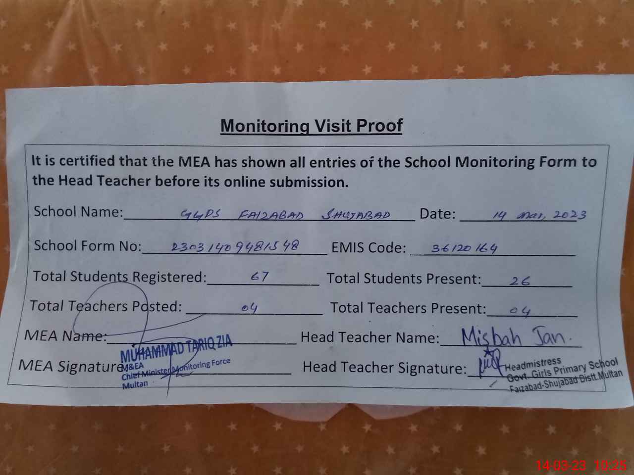 | Attendance Register | Head Teacher | MEA with School | Visit Proof |