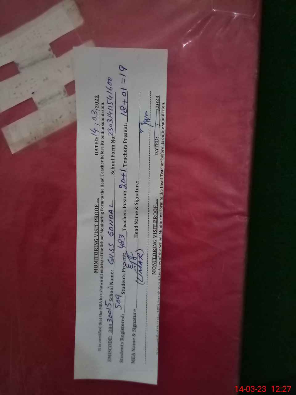 | Attendance Register | Head Teacher | MEA with School | Visit Proof |