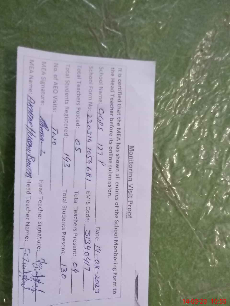 | Attendance Register | Head Teacher | MEA with School | Visit Proof |