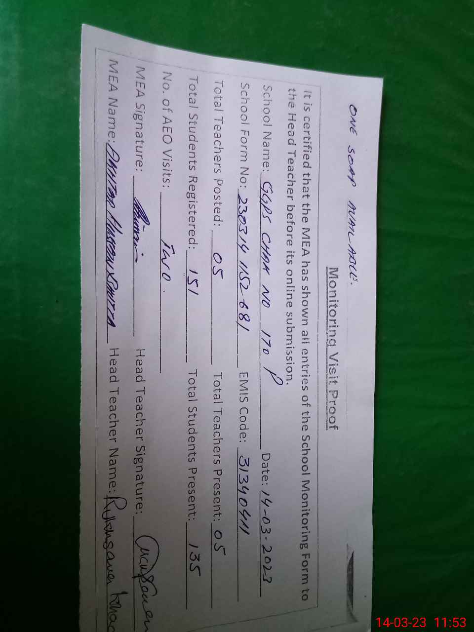| Attendance Register | Head Teacher | MEA with School | Visit Proof |