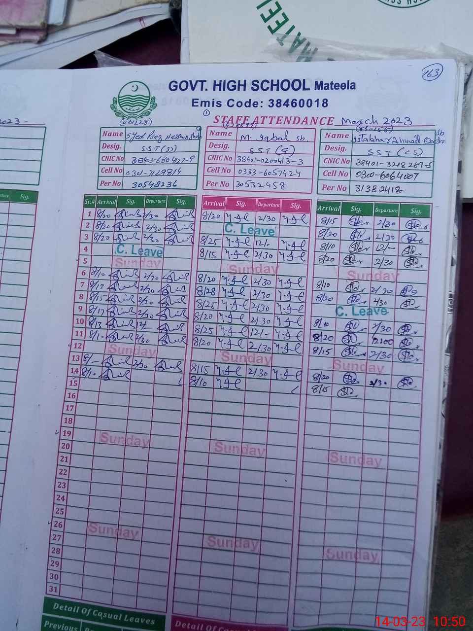 | CNIC | Full Name | Designation | R/C | Absence During Last Calender Month |