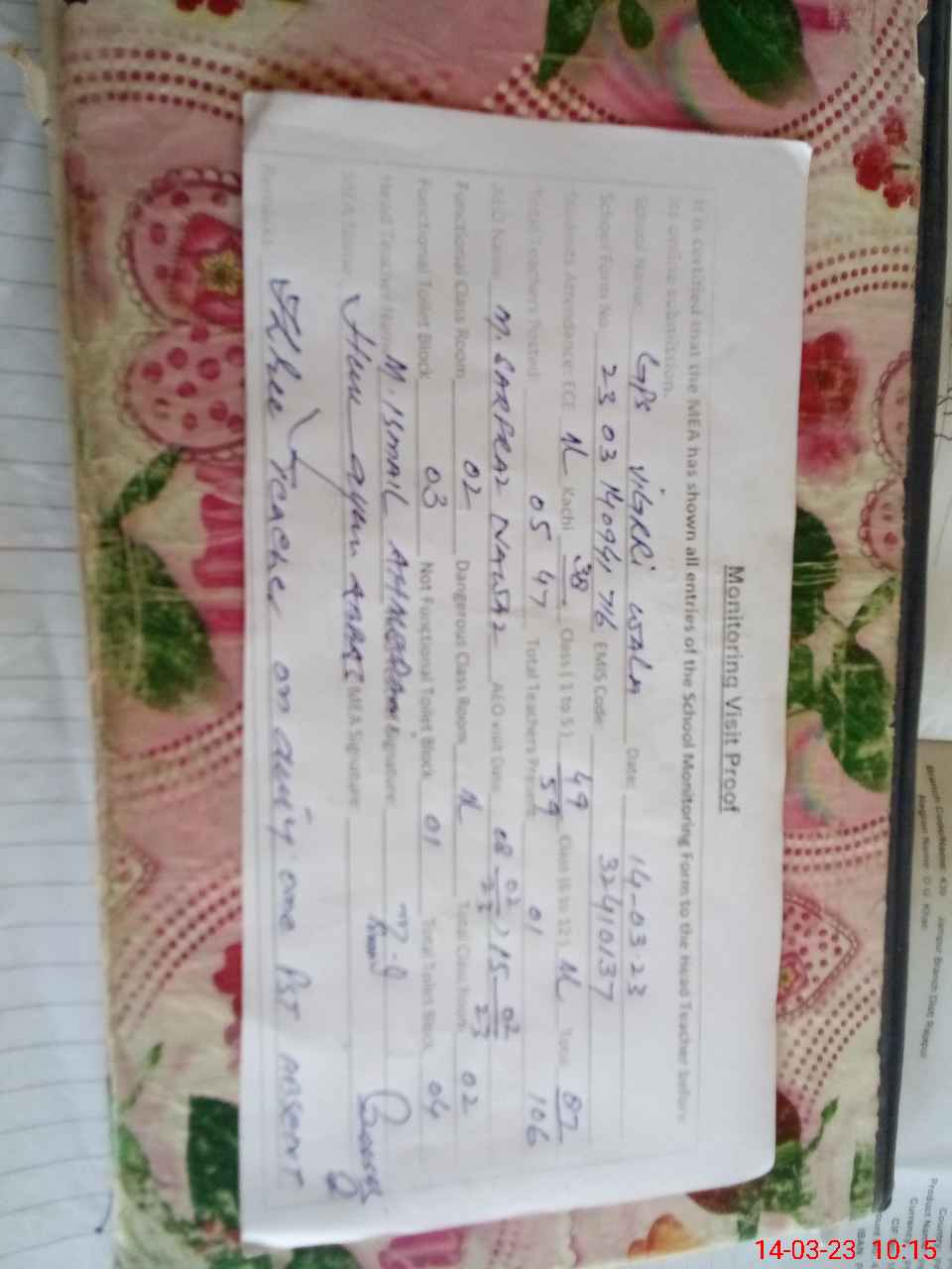 | Certified that this School was Inspected by the Undersigned MEA/DMO Today and the Information Stated Above is as Per Record. | |||||