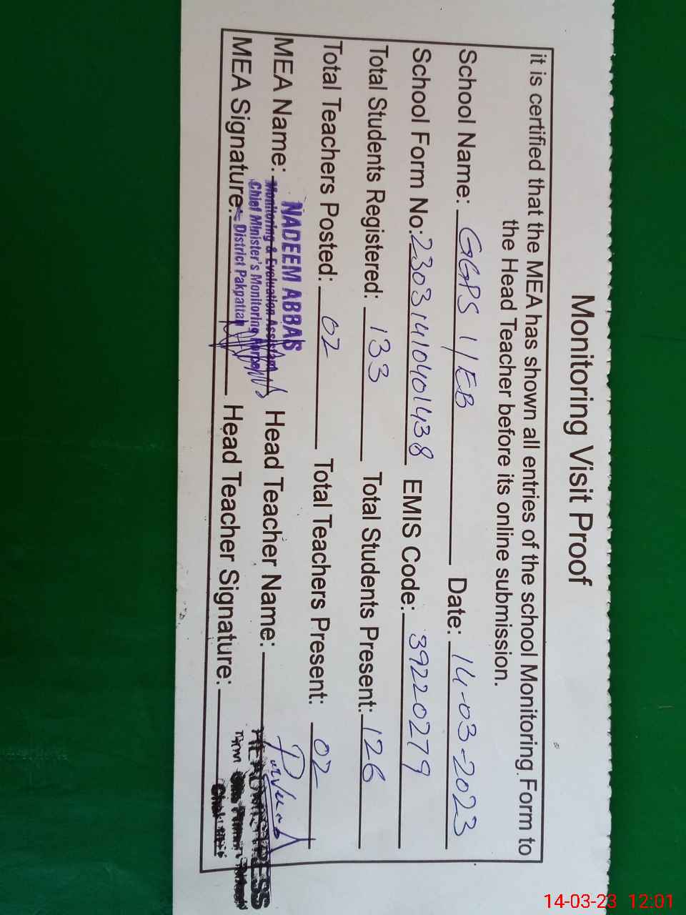 | Attendance Register | Head Teacher | MEA with School | Visit Proof |