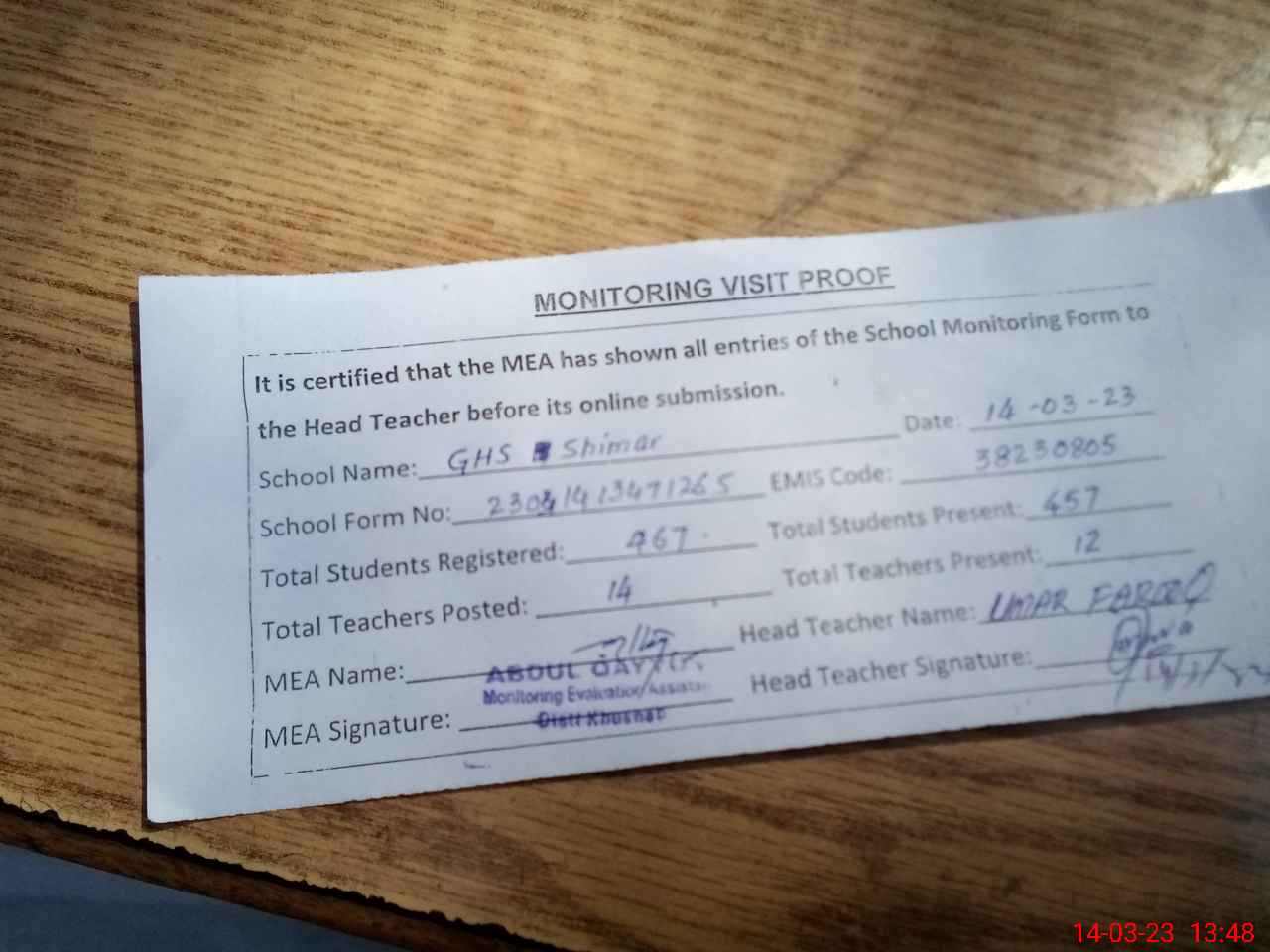 | EMIS Code: 38230805 | Name of School: GHS SHIMAR | |||