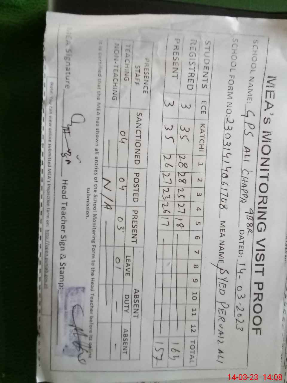 | Attendance Register | Head Teacher | MEA with School | Visit Proof |