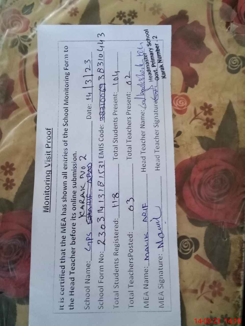 | Attendance Register | Head Teacher | MEA with School | Visit Proof |