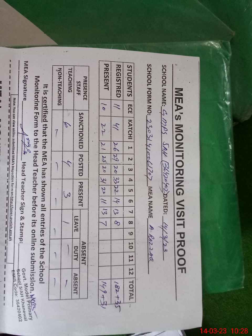 | Attendance Register | Head Teacher | MEA with School | Visit Proof |