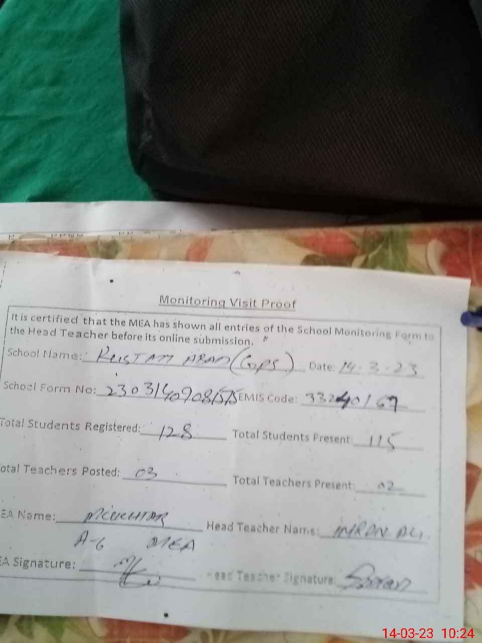 | Attendance Register | Head Teacher | MEA with School | Visit Proof |