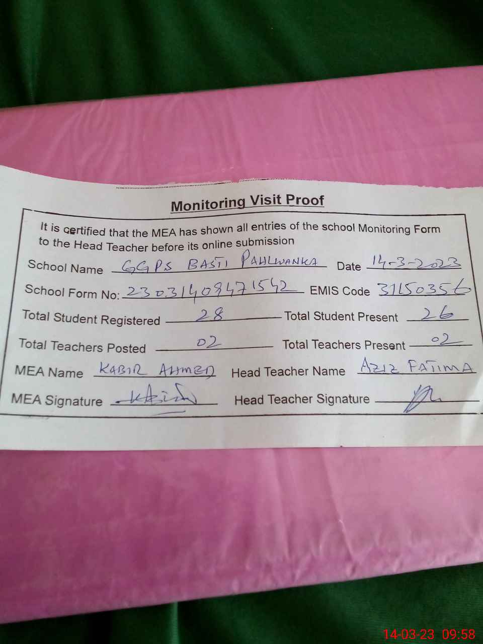 | Certified that this School was Inspected by the Undersigned MEA/DMO Today and the Information Stated Above is as Per Record. | |||||