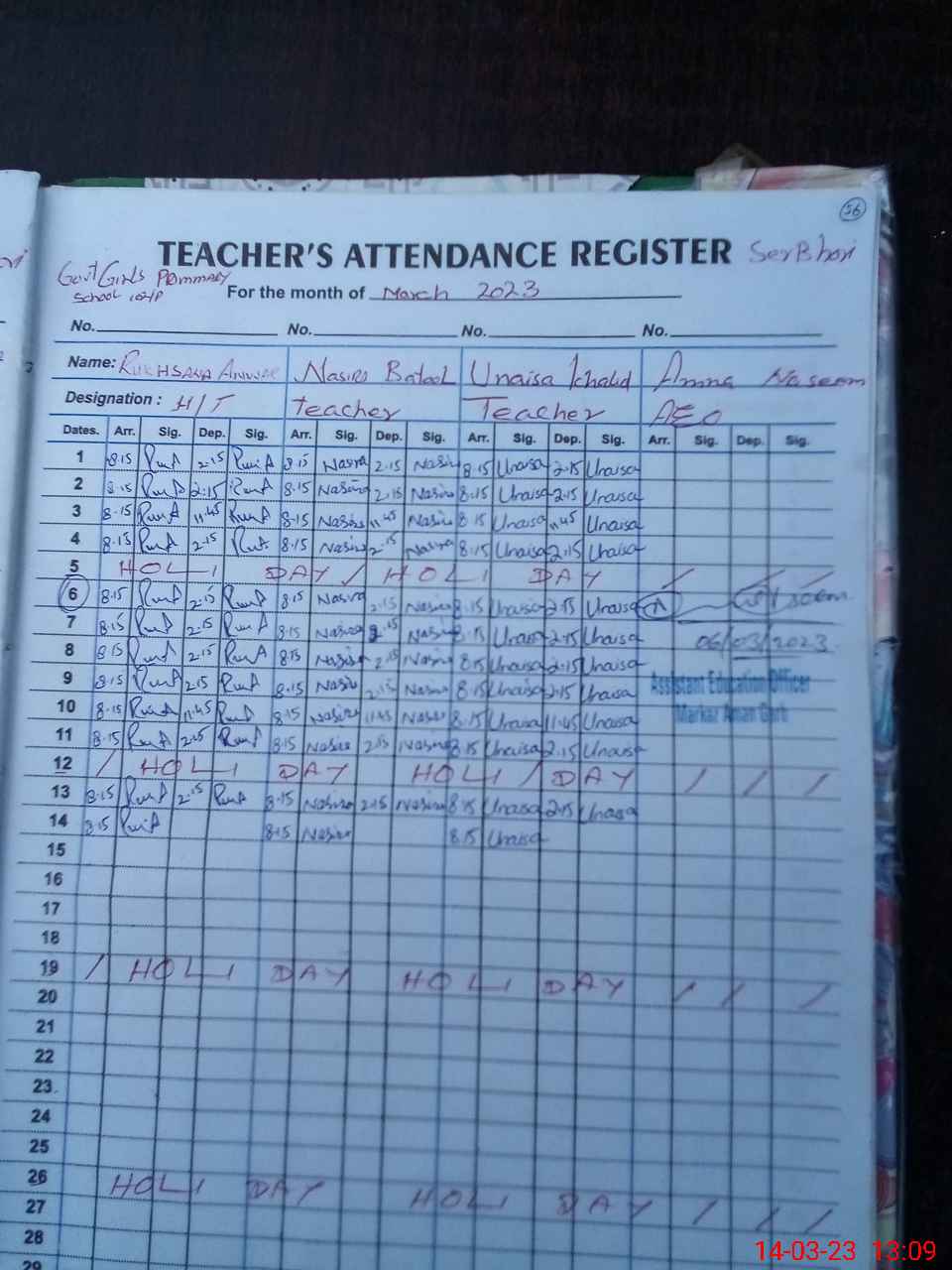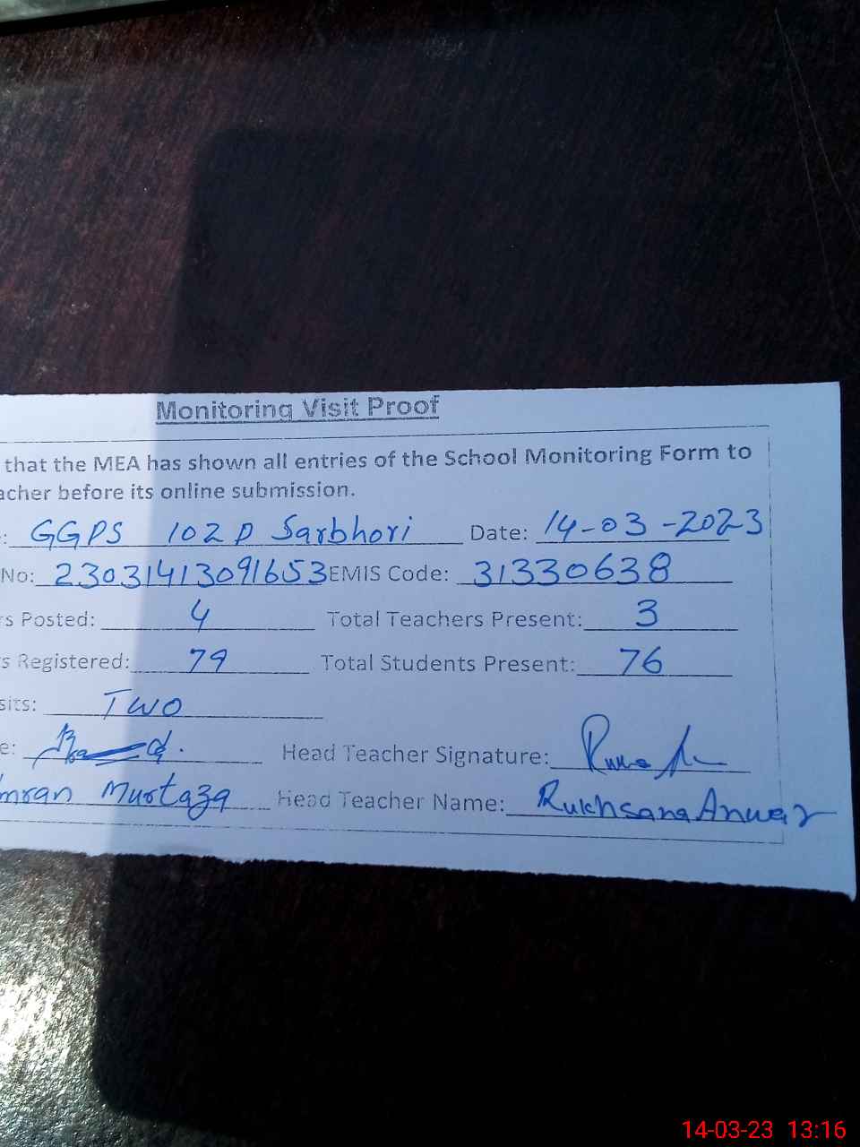 | Attendance Register | Head Teacher | MEA with School | Visit Proof |