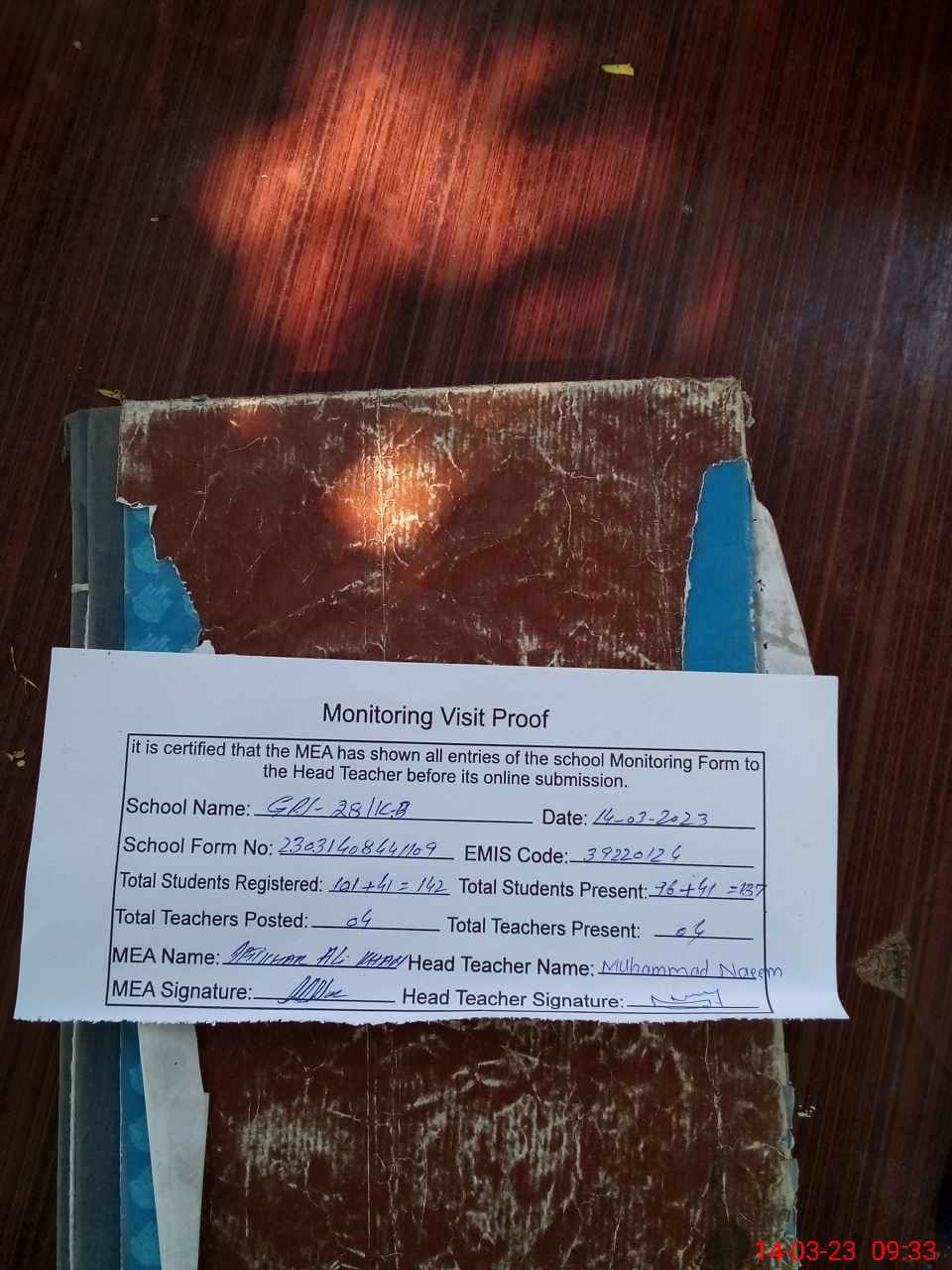 | Attendance Register | Head Teacher | MEA with School | Visit Proof |