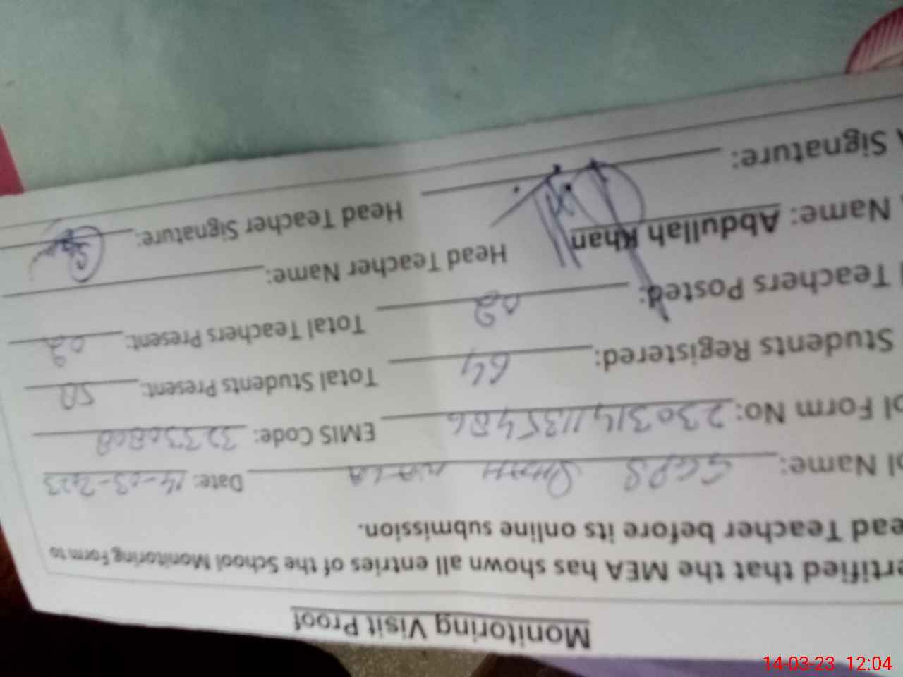 | Attendance Register | Head Teacher | MEA with School | Visit Proof |