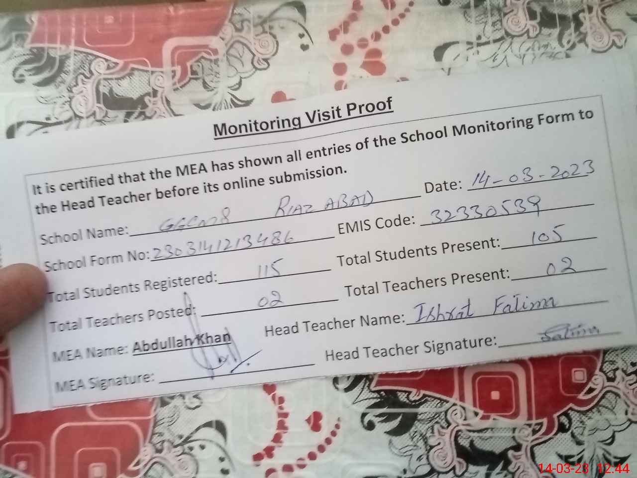 | Attendance Register | Head Teacher | MEA with School | Visit Proof |