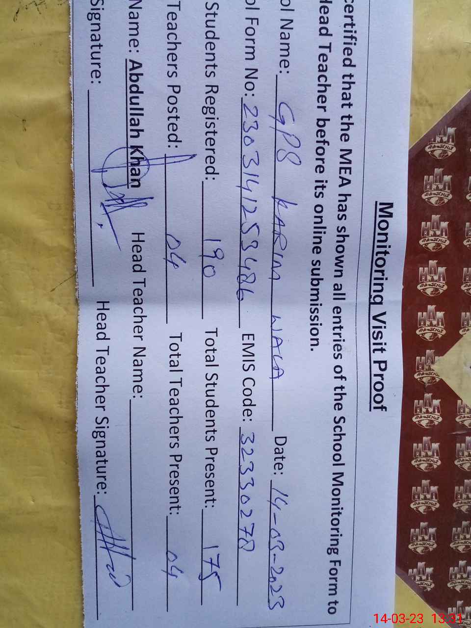 | EMIS Code: 32330278 | Name of School: GPS KARIM WALA | |||