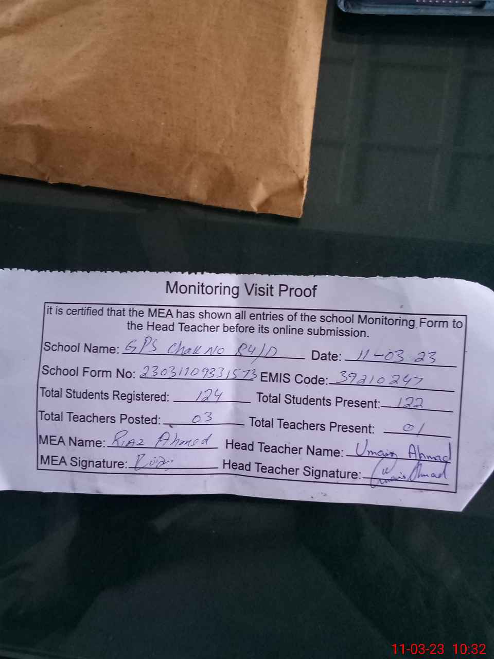 | Attendance Register | Head Teacher | MEA with School | Visit Proof |