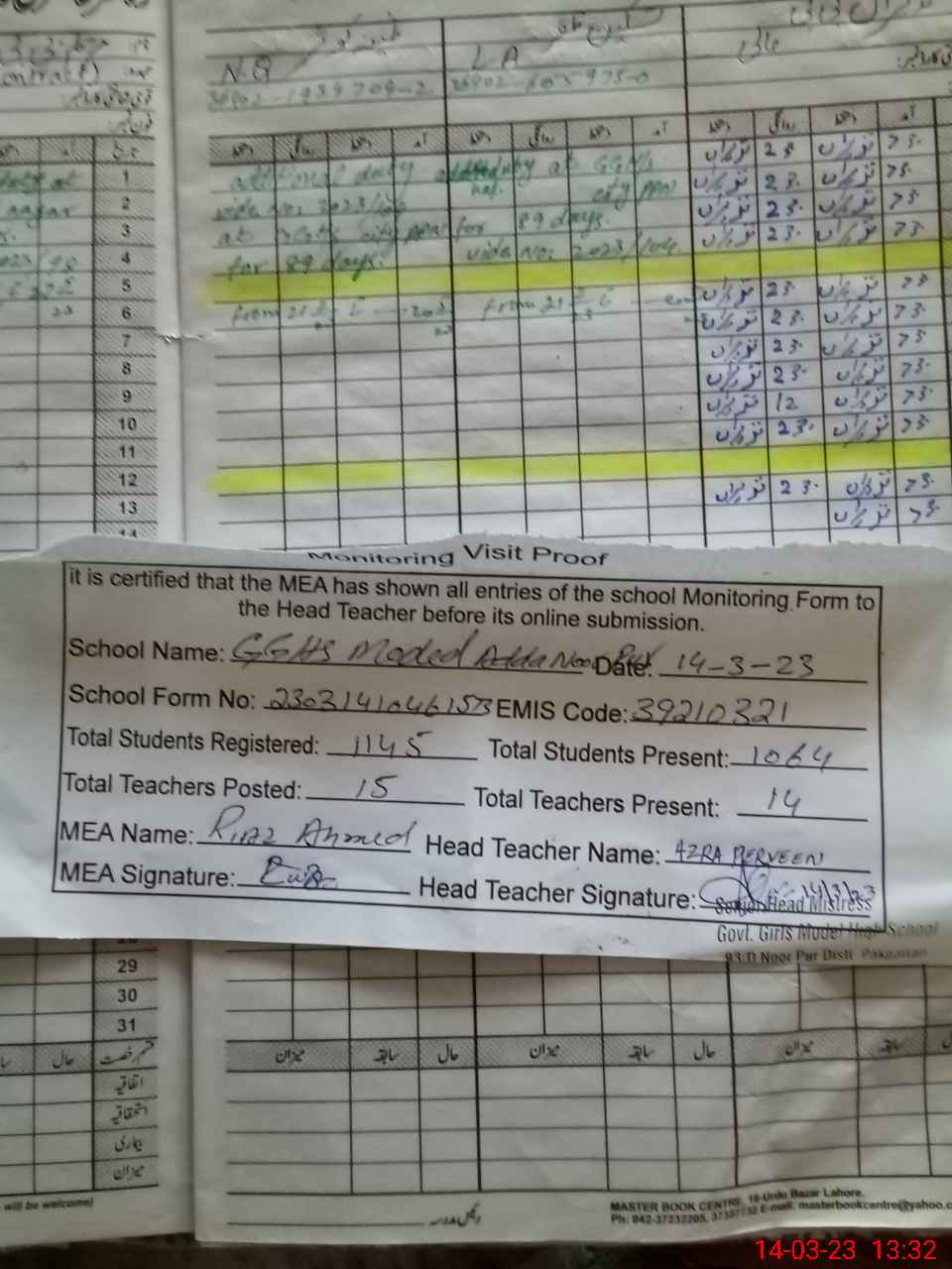 | Attendance Register | Head Teacher | MEA with School | Visit Proof |