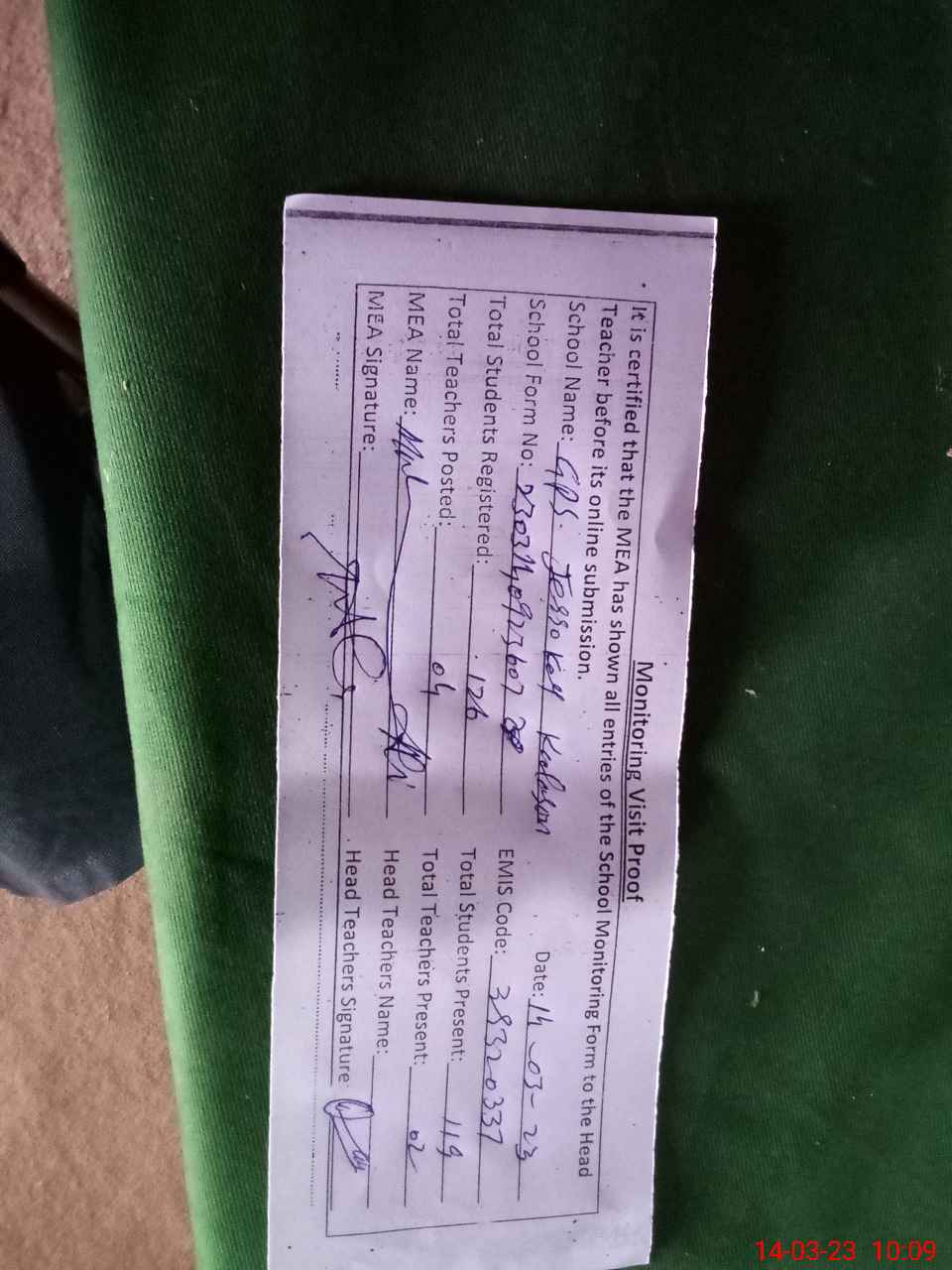 | Attendance Register | Head Teacher | MEA with School | Visit Proof |