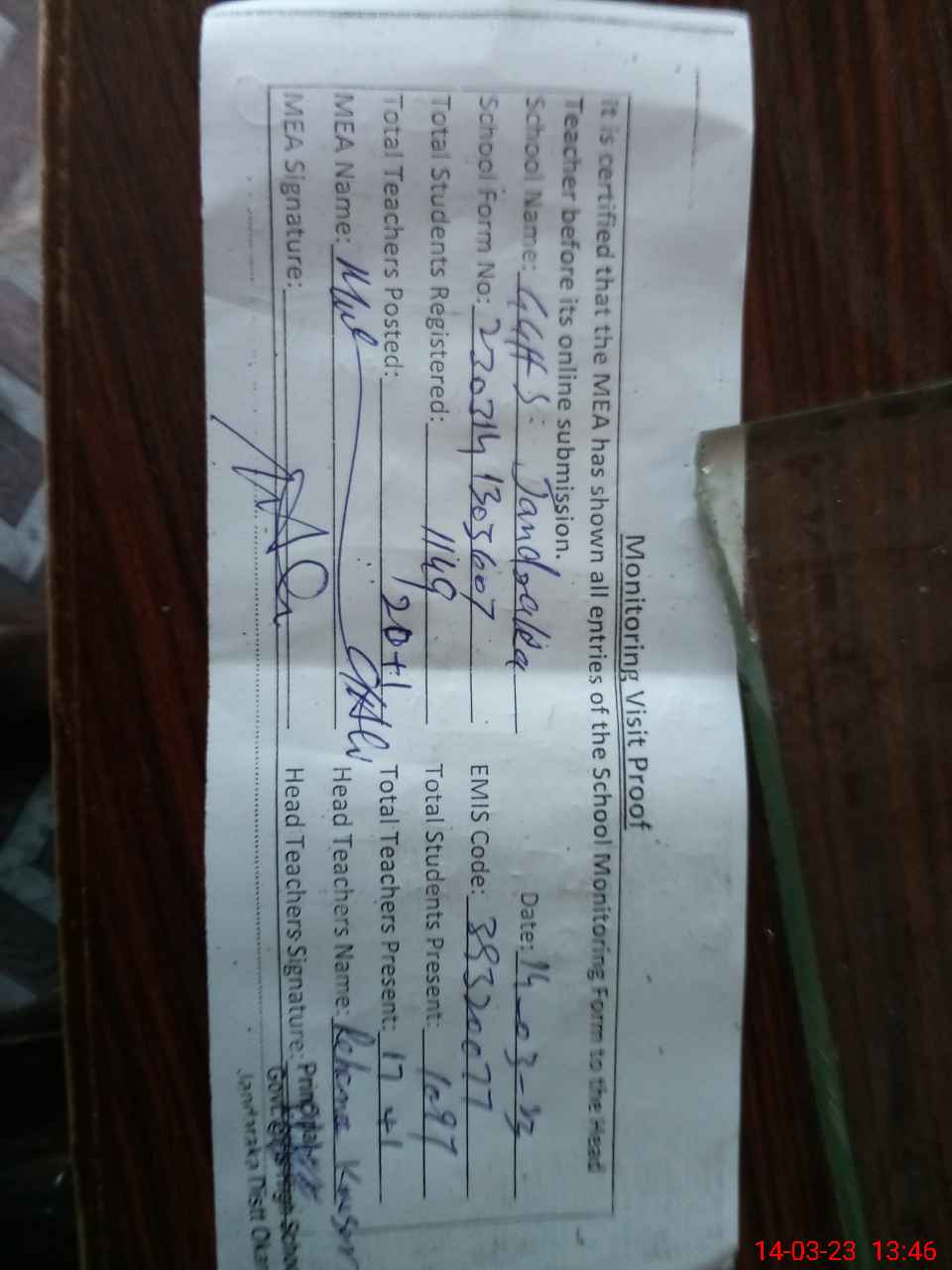| Attendance Register | Head Teacher | MEA with School | Visit Proof |