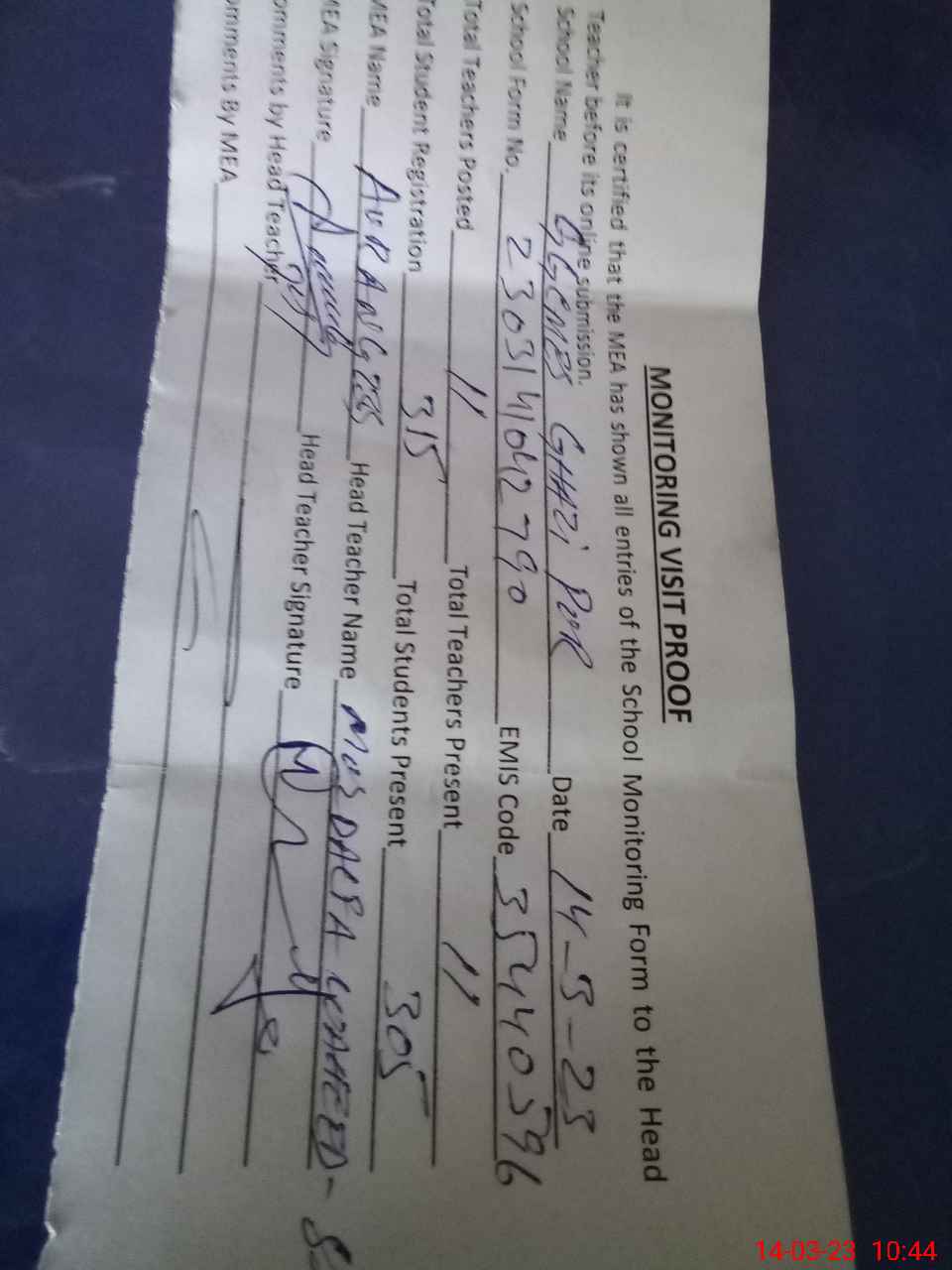 | Attendance Register | Head Teacher | MEA with School | Visit Proof |